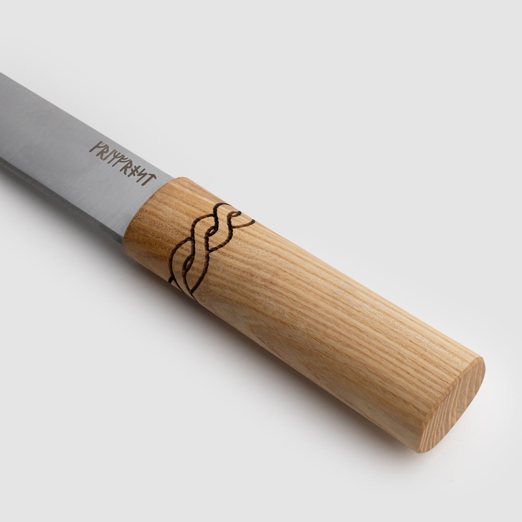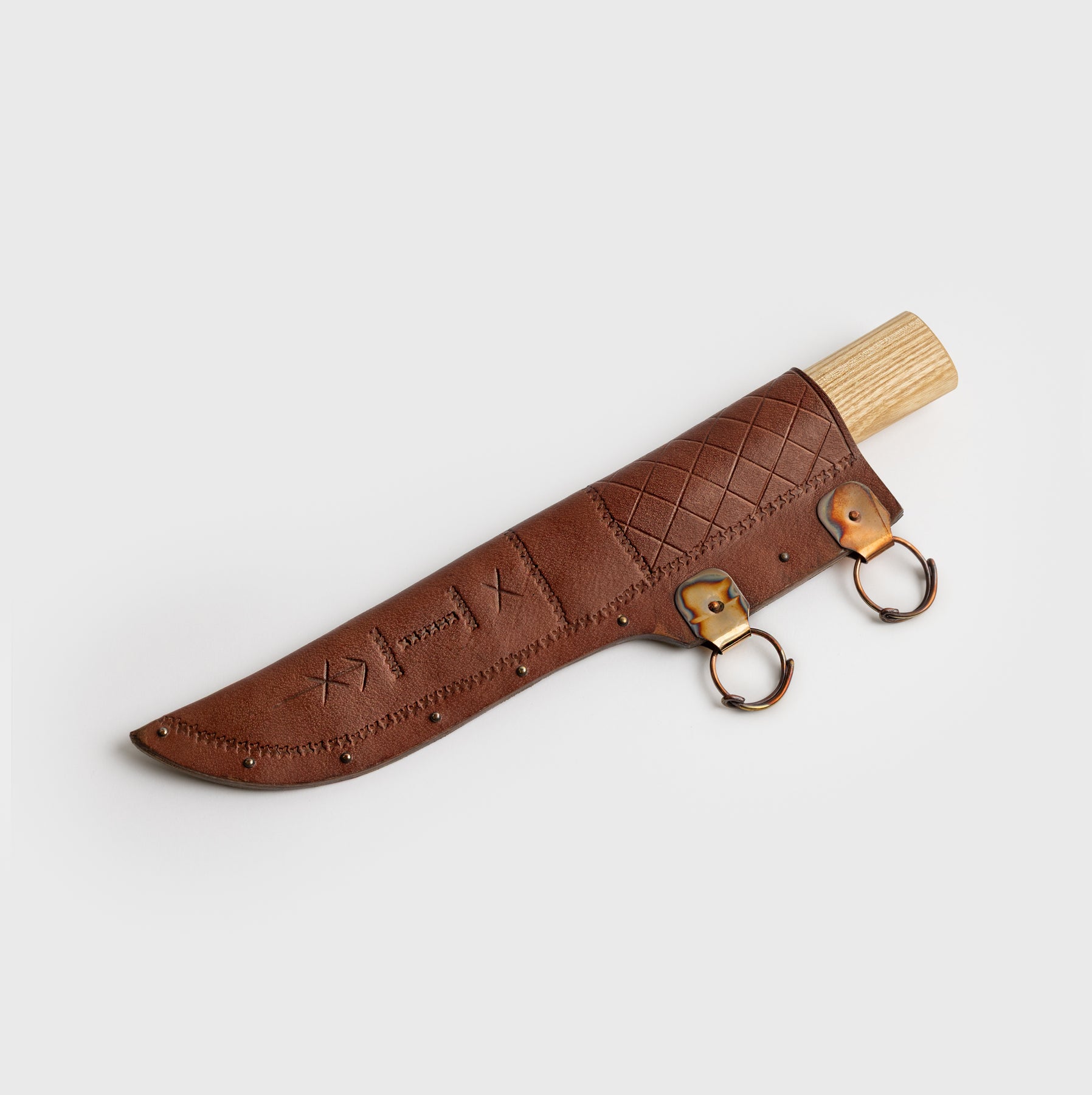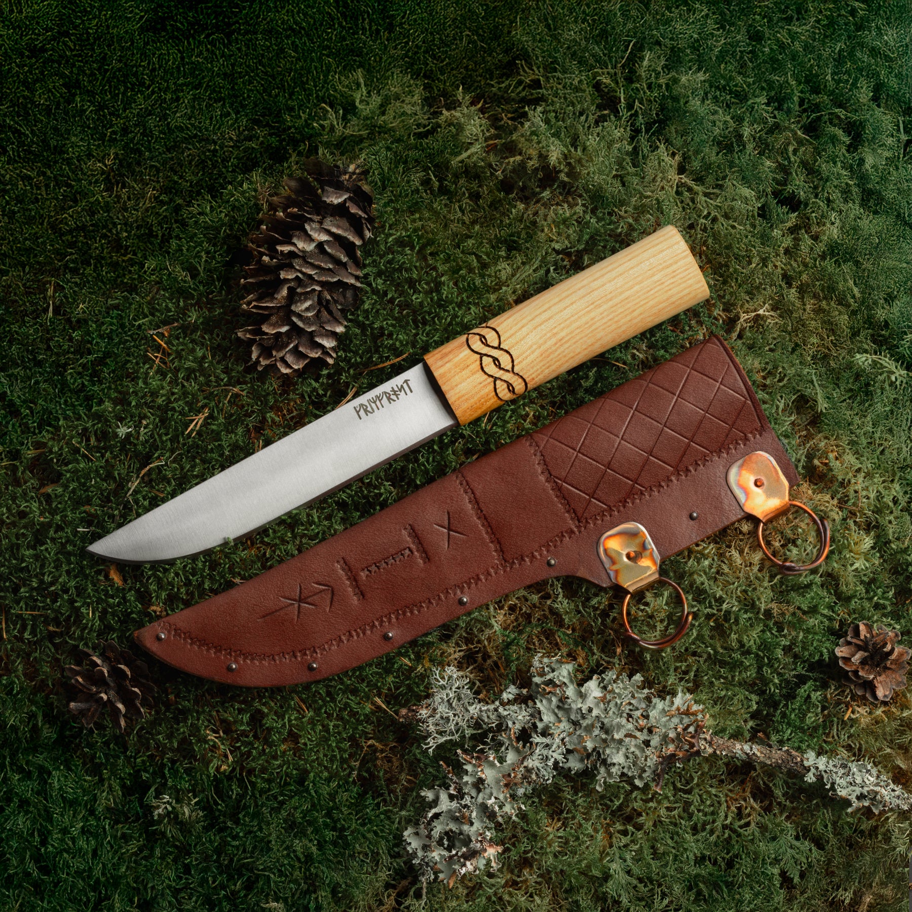 Small Seax with a decorated leather scabbard and a knotwork design on the ash handle. Comes with Grimfrost's runic logo on the blade.