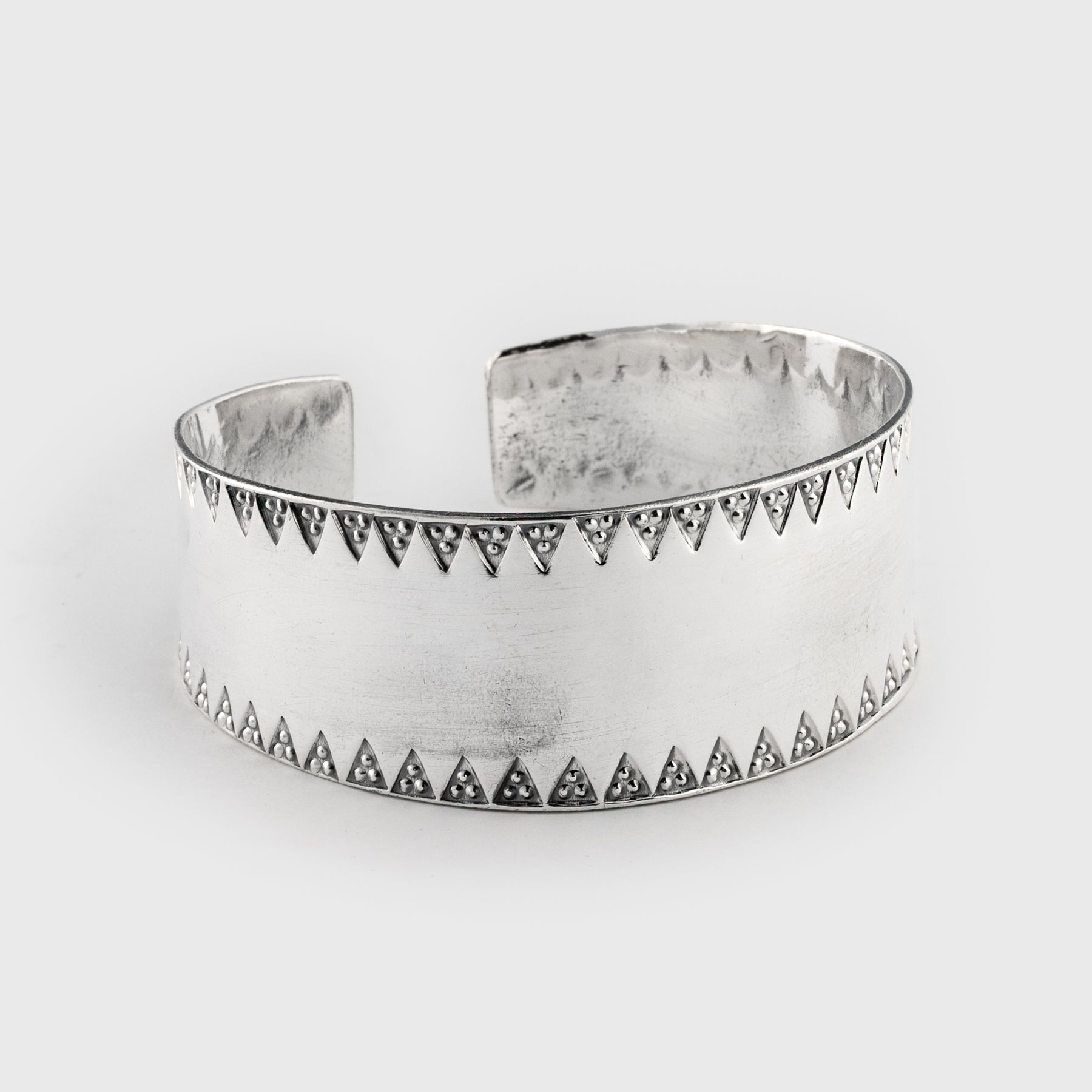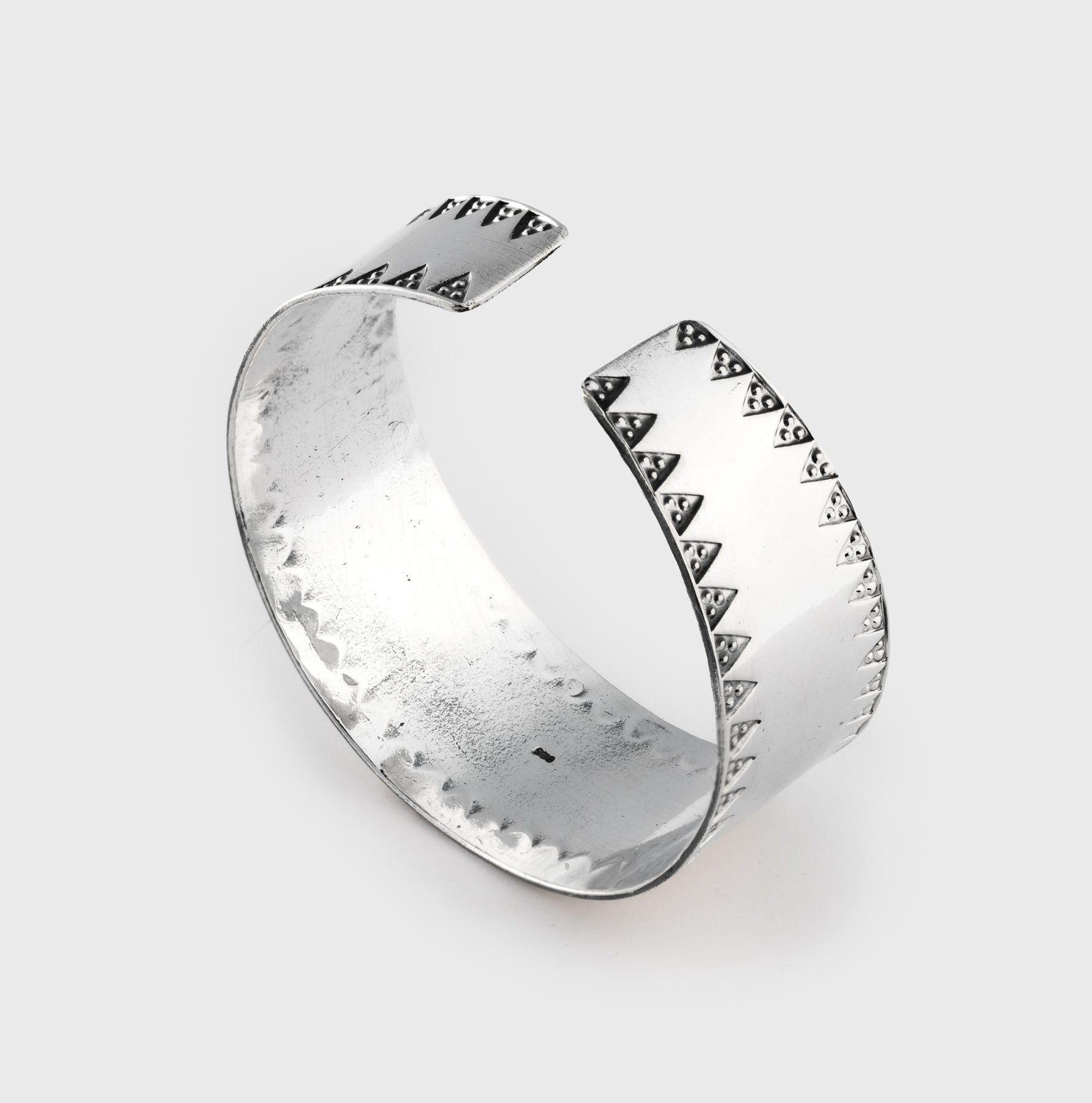 The practice of decorating silver jewelry with stamps was very prevalent practice during the Viking Age. The most common shape was a triangle with one or three pellets. Applying stamps requires a steady hand since the punch has to be made in a single blow.
