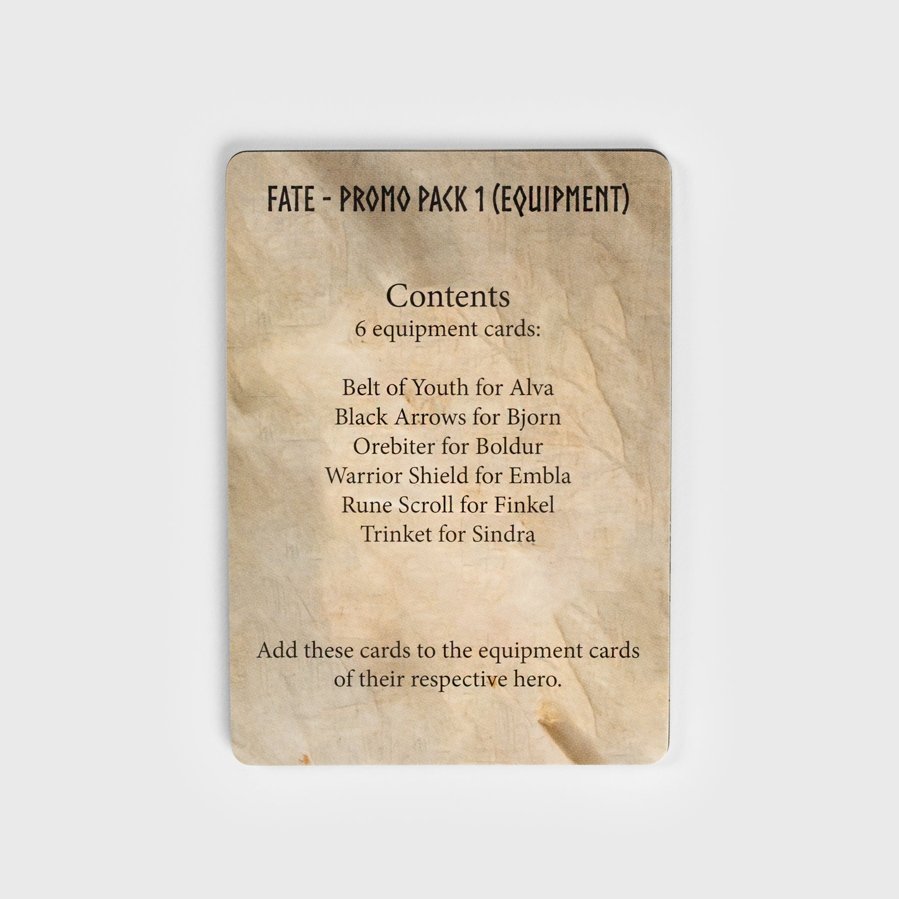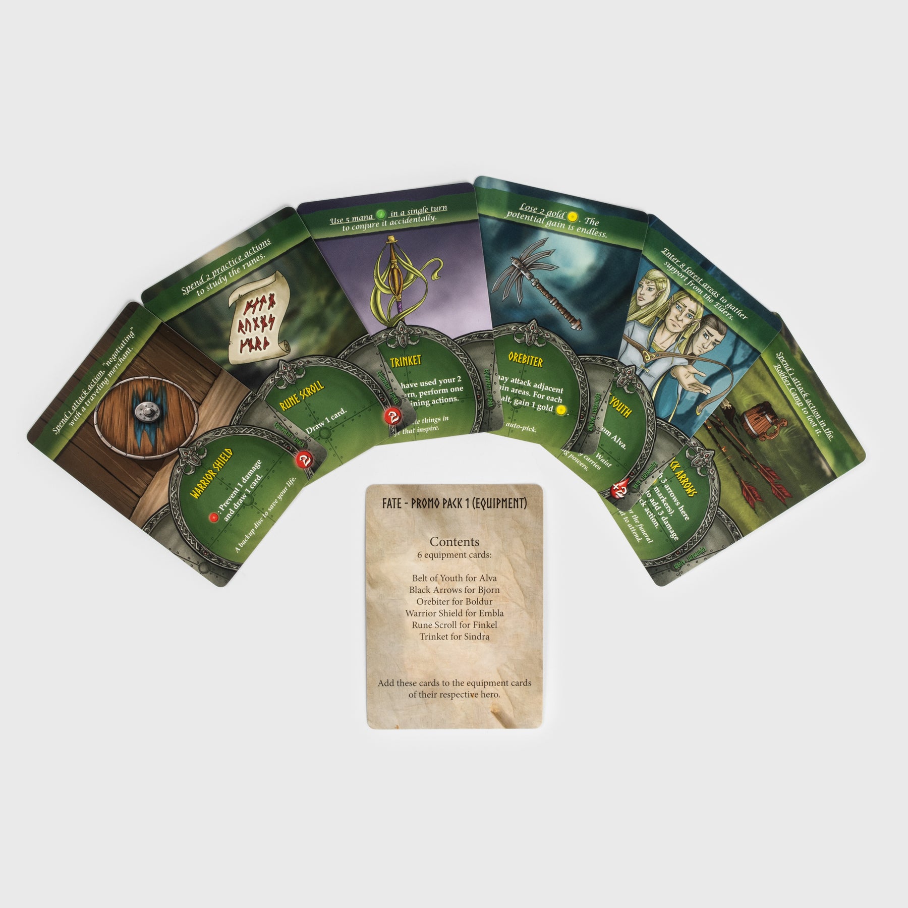 This pack contains 6 equipment cards, 1 for each hero in Fate - Defenders of Grimheim (including equipment cards for the 2 expansion heroes Sindra & Finkel).