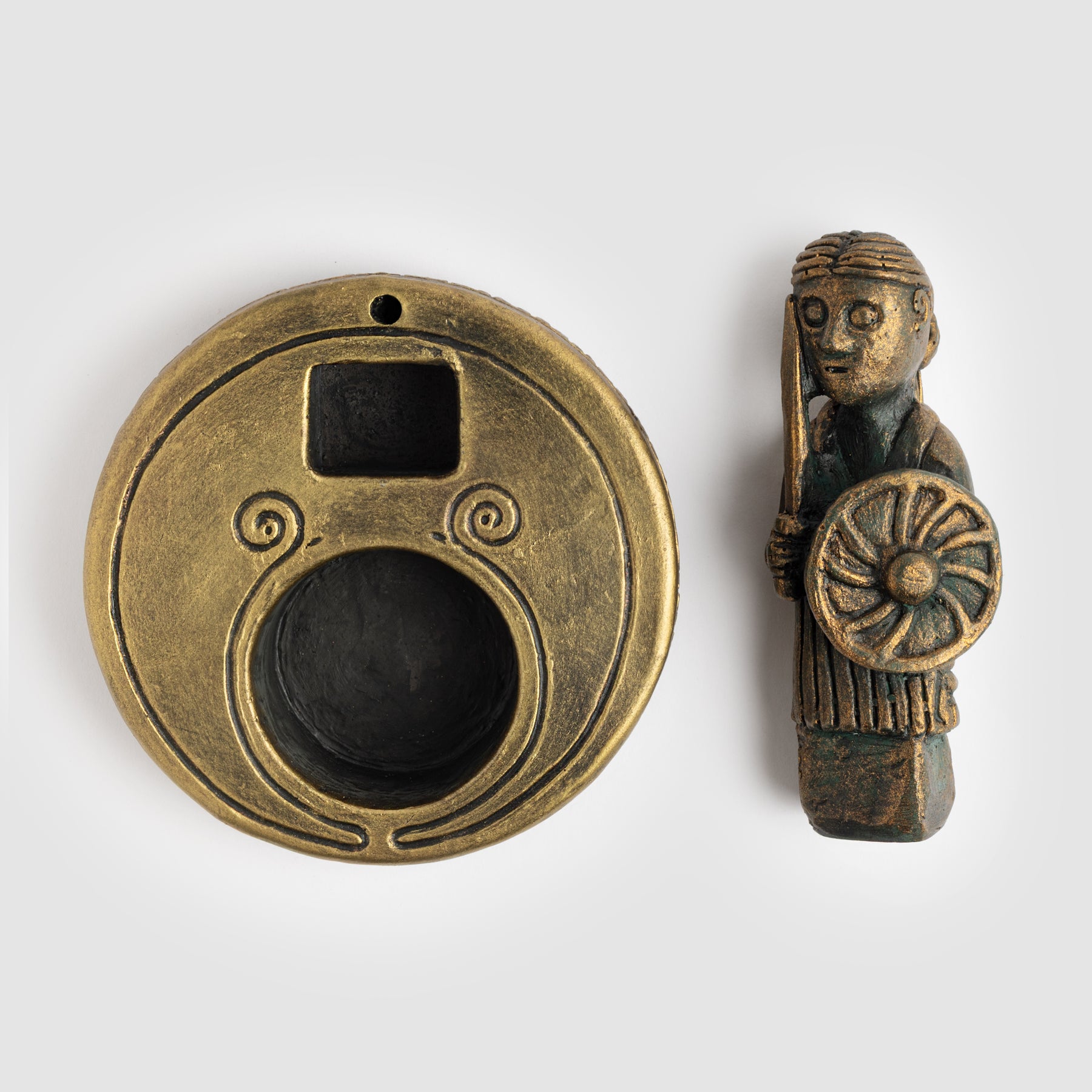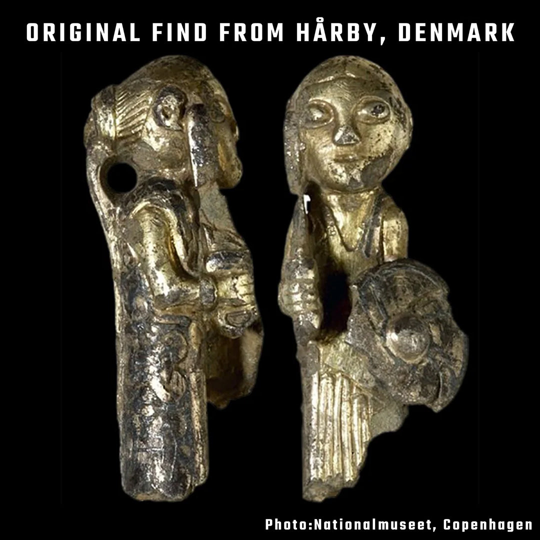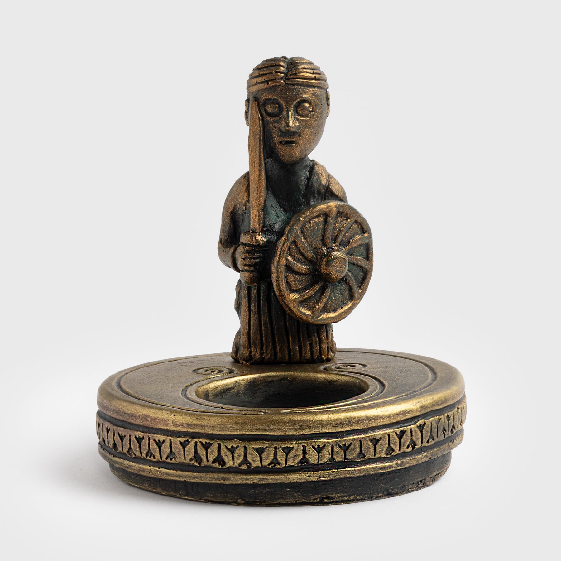 Handmade travel altar with a Freyja figurine, a tealight holder and an incense holder. The figurine can be easily removed for transportation. It can also be replaced with another god from the series. This figurine is an artistic interpretation of the Hårby find, discovered on the island of Funen in Denmark. The original artifact portrays a woman with her hair gathered into a high knot, dressed in a V-necked, pleated gown adorned with intricate knotwork. She wields a sword in her left hand and carries a shield in her right.