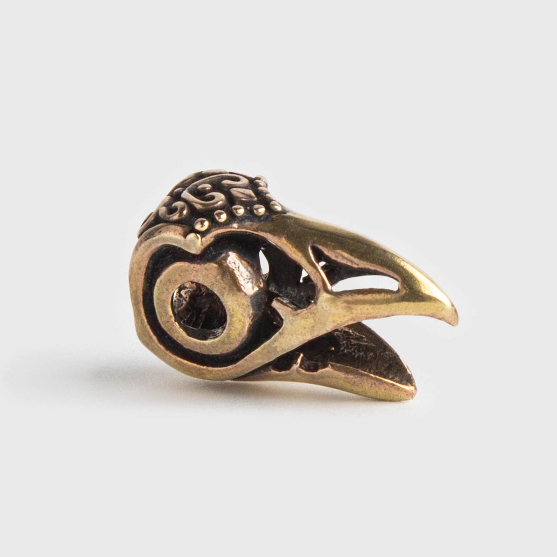 A large beard ring in bronze in the shape of a raven's head. Use two rings to represent Huginn and Muninn, the ravens of the god Odin.