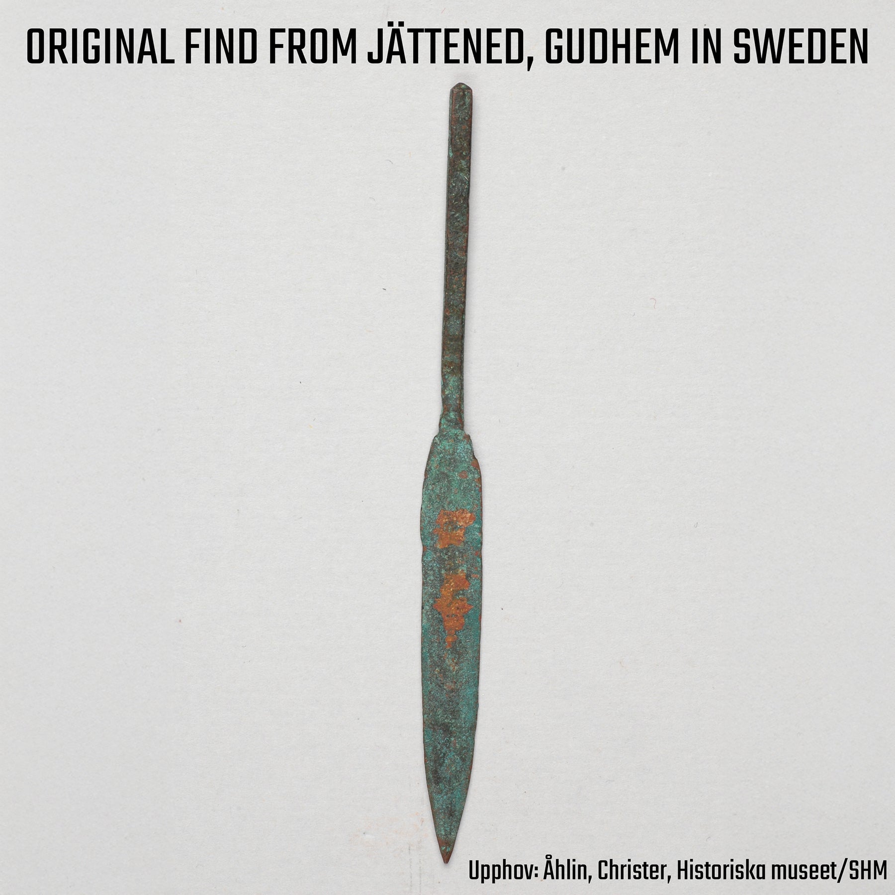 Miniature spear relic that is a based of the original find made in Jättened, Gudhem in Sweden. A fitting design has been added to it. These miniature spears are representations of the god Odin, and depict his spear Gungnir. Just like the original, this reproduction is crafted in solid bronze. Wear it as an imposing amulet, or tucked away in a pocket or pouch for luck.