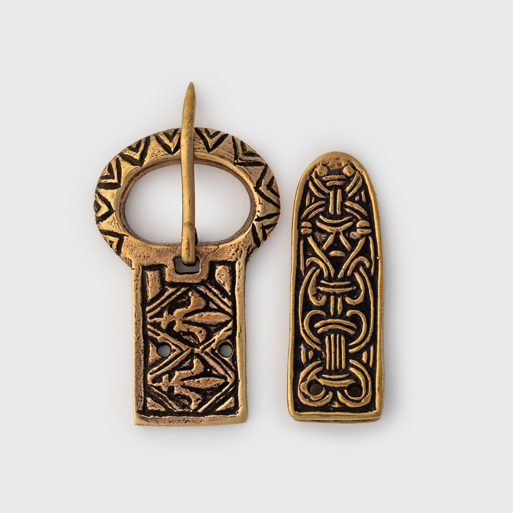 A set with a bronze belt buckle and strap end in typical Viking Age style. They fit a belt that is 15 mm wide and approx. 2.5 - 3 mm thick. The buckle and strap-end are attached with rivets or sewn through the pre-drilled holes. Rivets are not included.