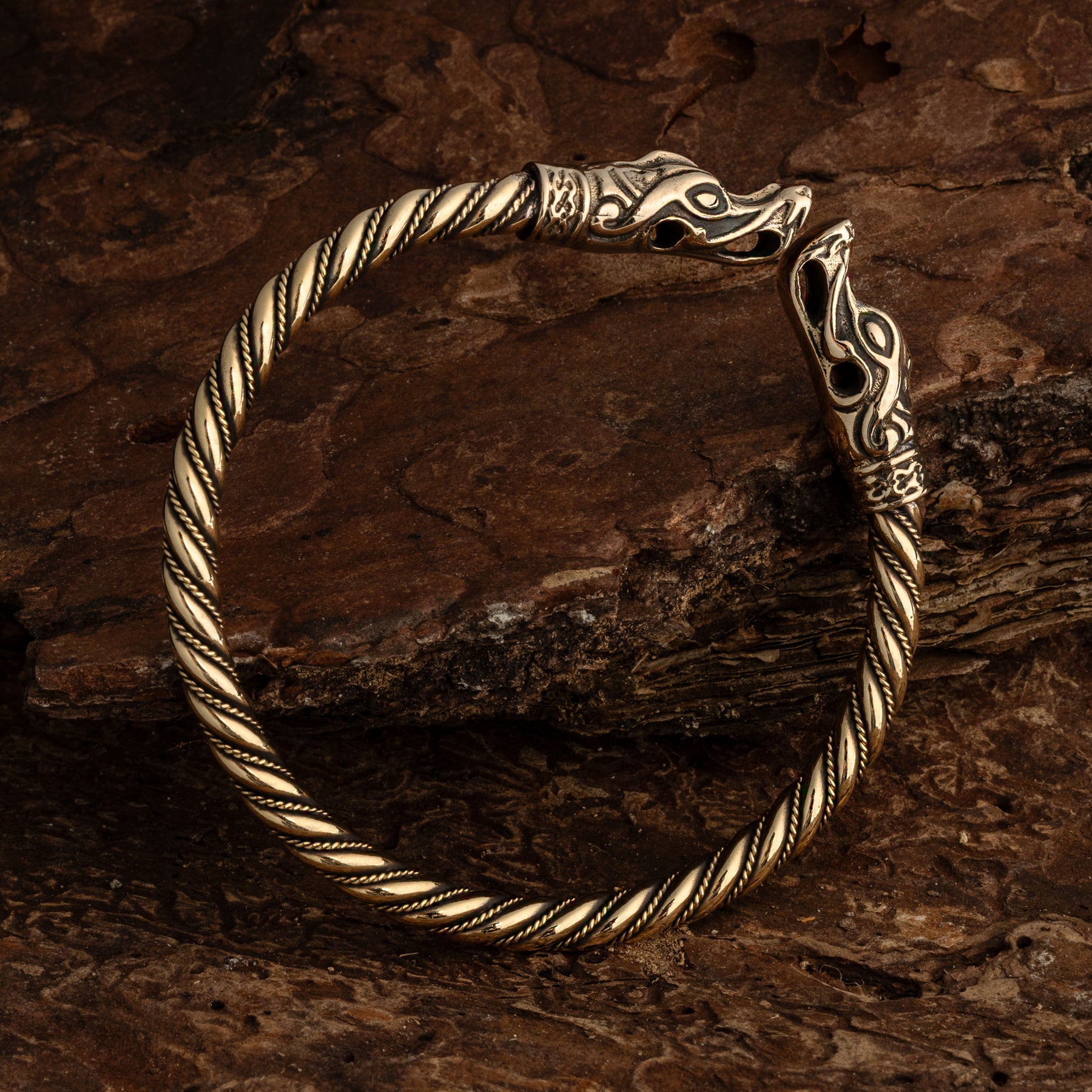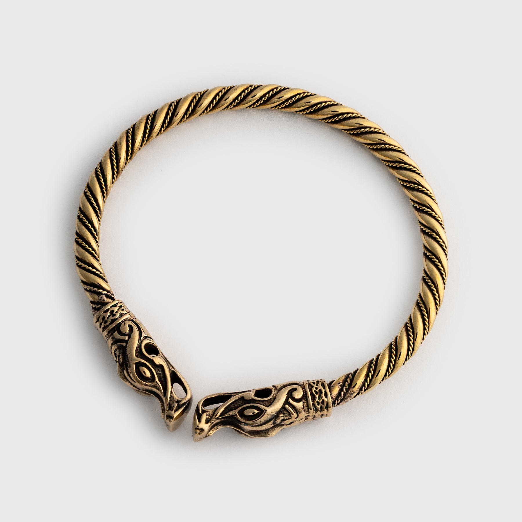 A twisted Viking armring in solid brass ending in dragon heads that are based on a find from Gotland, Sweden. Wear it around your wrist and push it up your arm if you need to get it out of the way.