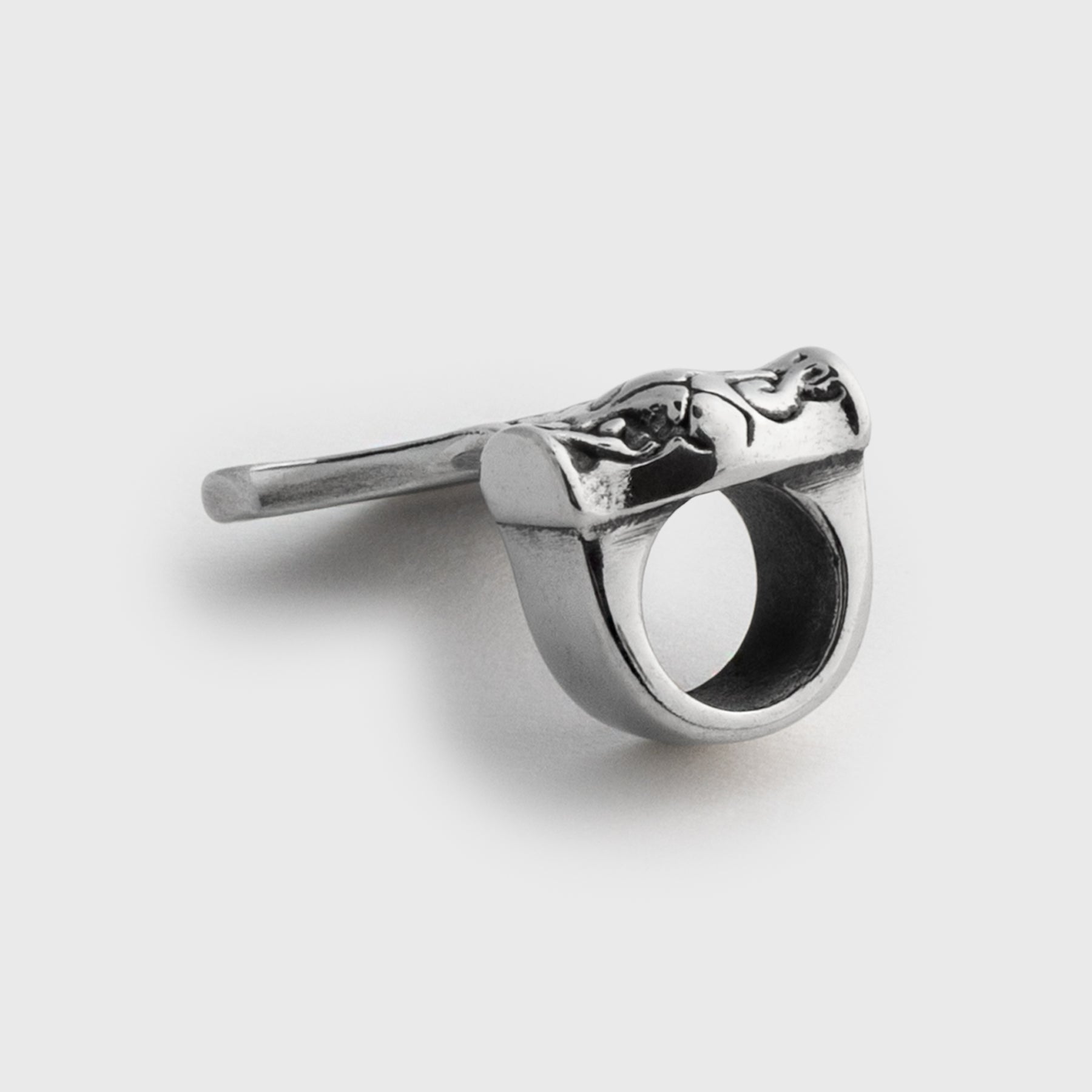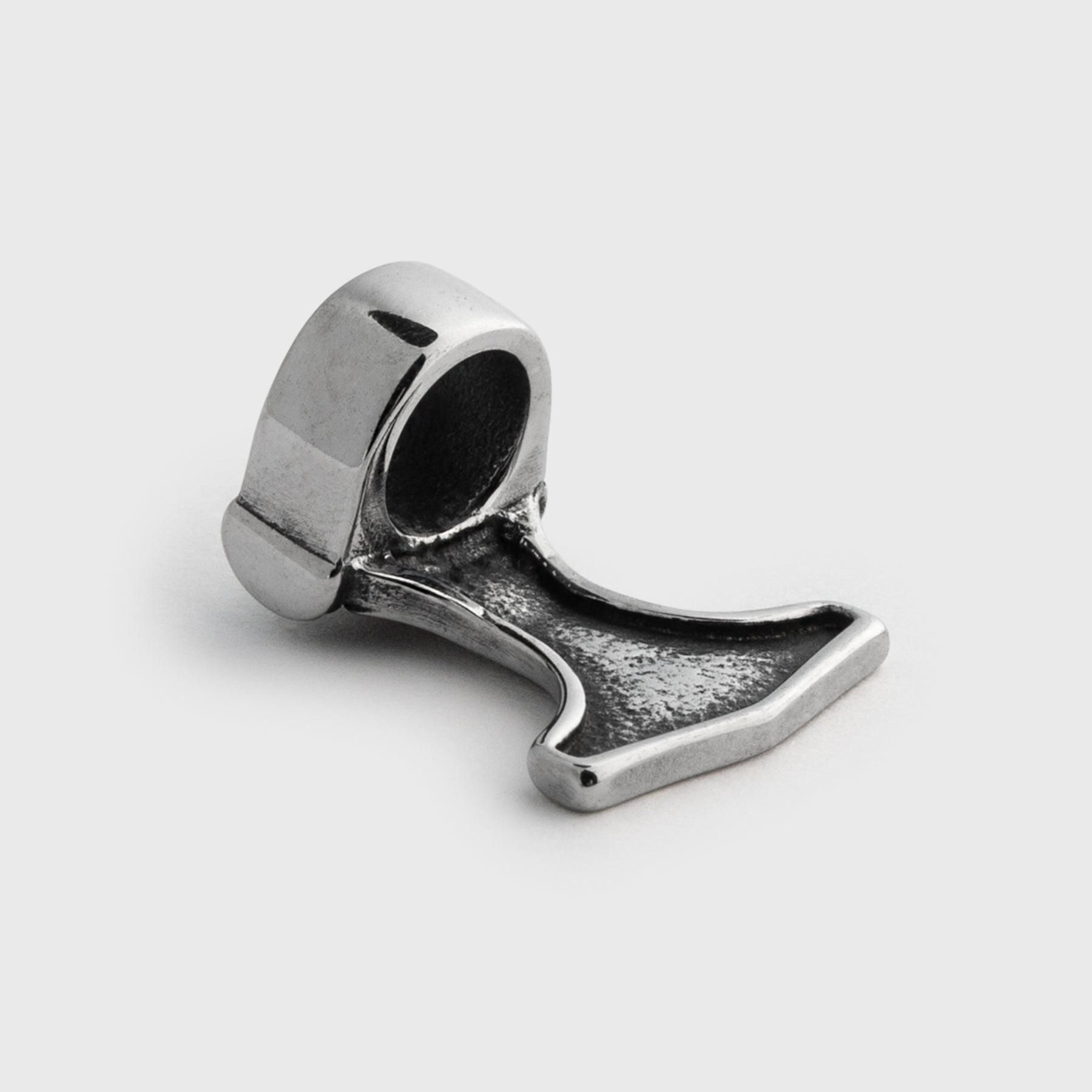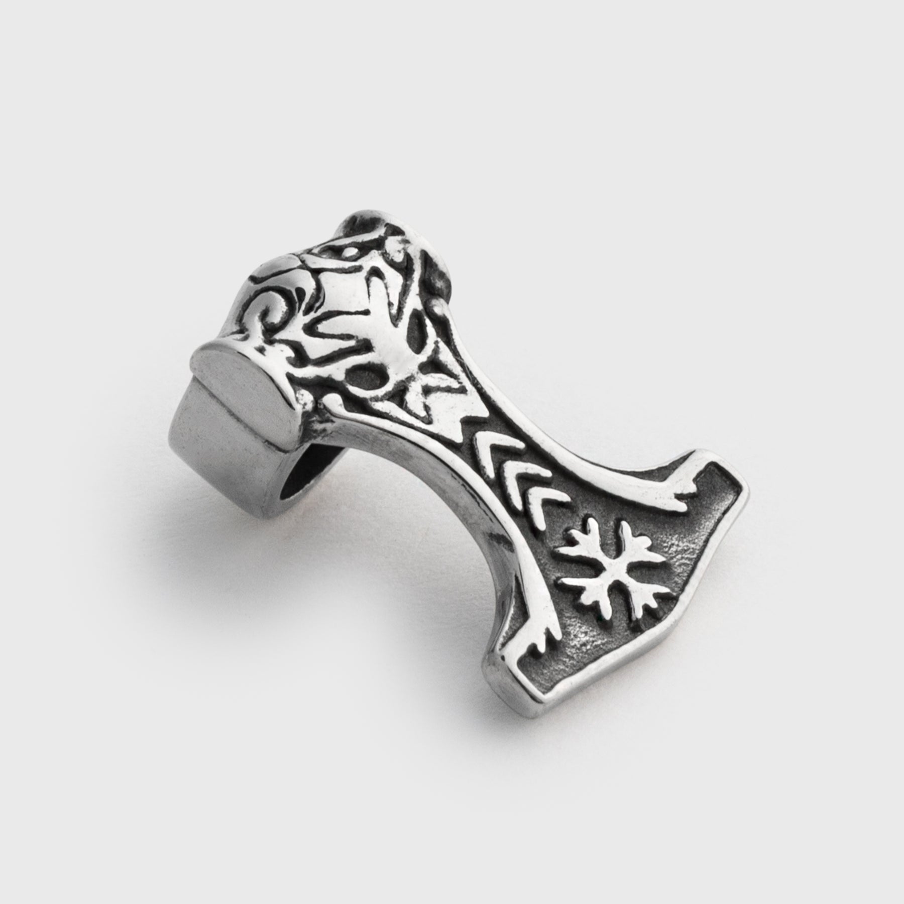 Thor's Hammer beard ring in Stainless Steel that depicts the mask of one-eyed Odin and the Ægishjálmur symbol. Also known as the 'Helm of Awe', it is an old magical symbol that induces fear in enemies and protects against abuse of power.