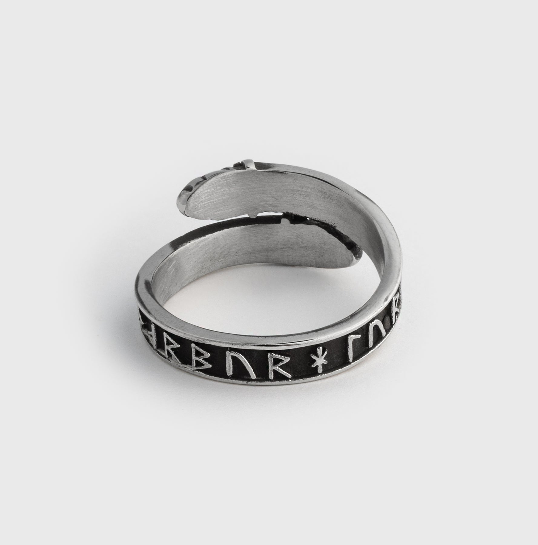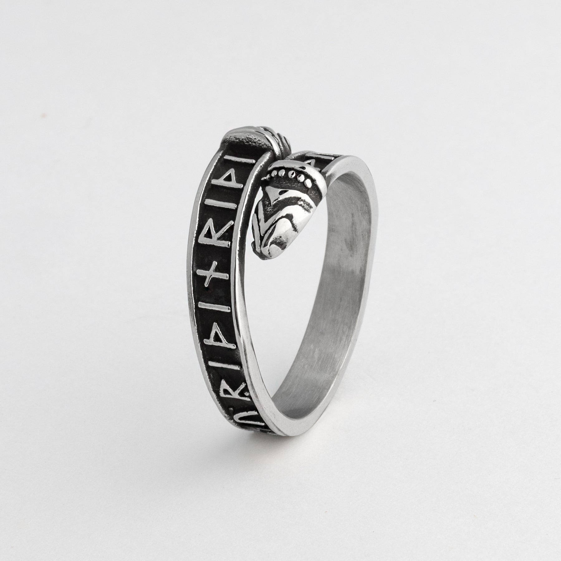 Ring crafted in stainless steel in the shape of a lindworm. Written on it with the Younger Futhark is: "Þorr jarðar burr hlórriði einriði", which translates to: "Thor, Earth's son, the Thundering Storm, He who travels alone." They are all different names, kennings, used for Thor. The ring can be adjusted slightly in size.