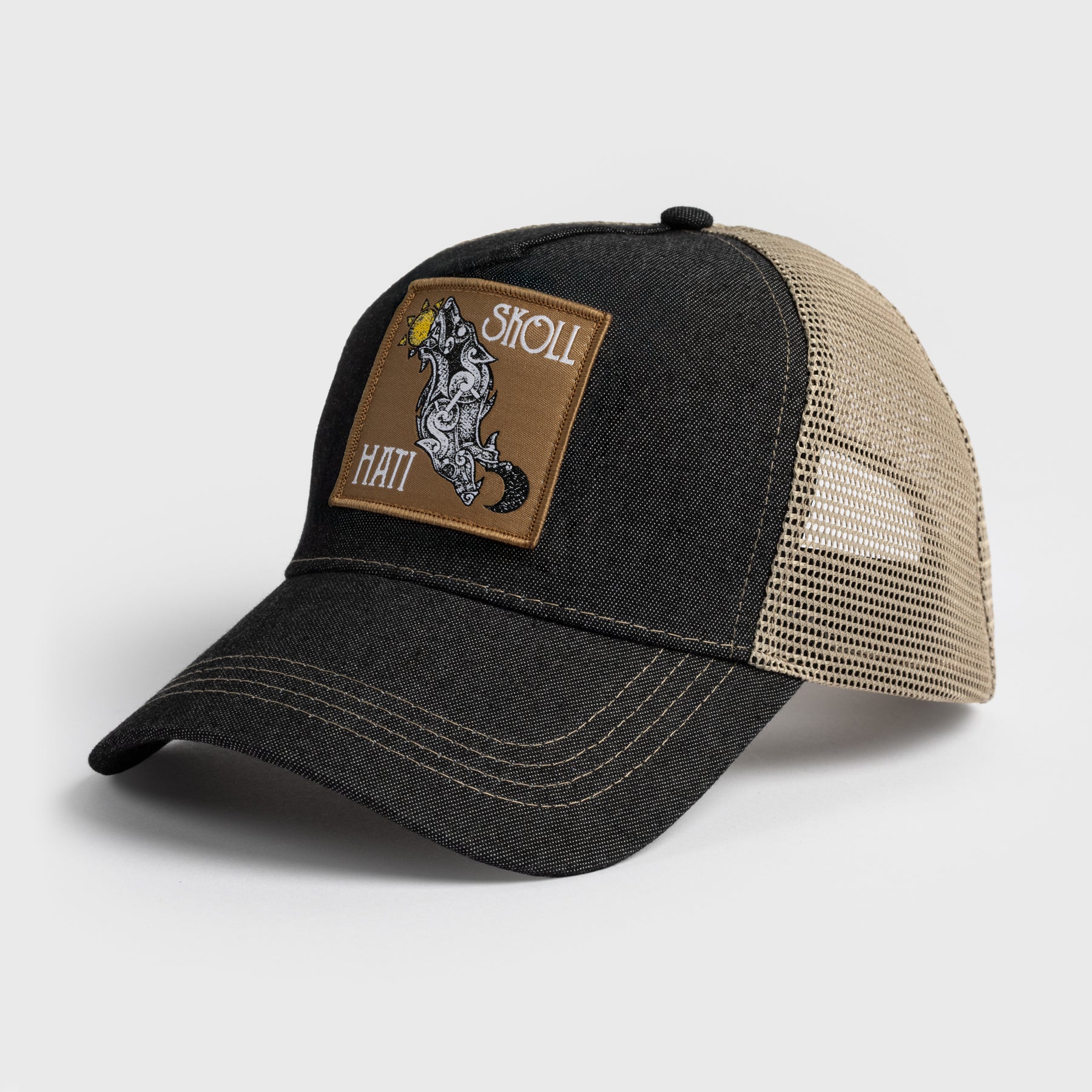 Top quality structured trucker cap with mesh panels. An image of Hati and Sköll, the wolves destined to swallow the moon and the sun come Ragnarök, is added to the front. The inside is lined with tricot twill fabric for superior comfort and breathability.