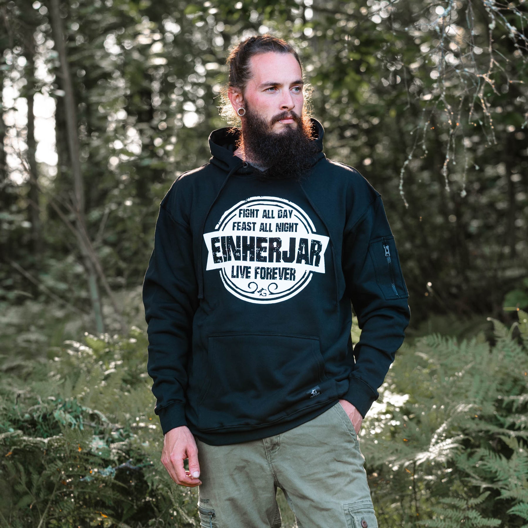 Soft and comfortable hoodie in a classic black color. The hoodie comes with a zipped utility pocket on the left arm and spacious kangaroo pouch pockets. To top things off, we have given the drawstring eyelets a Younger Futhark runic circle.