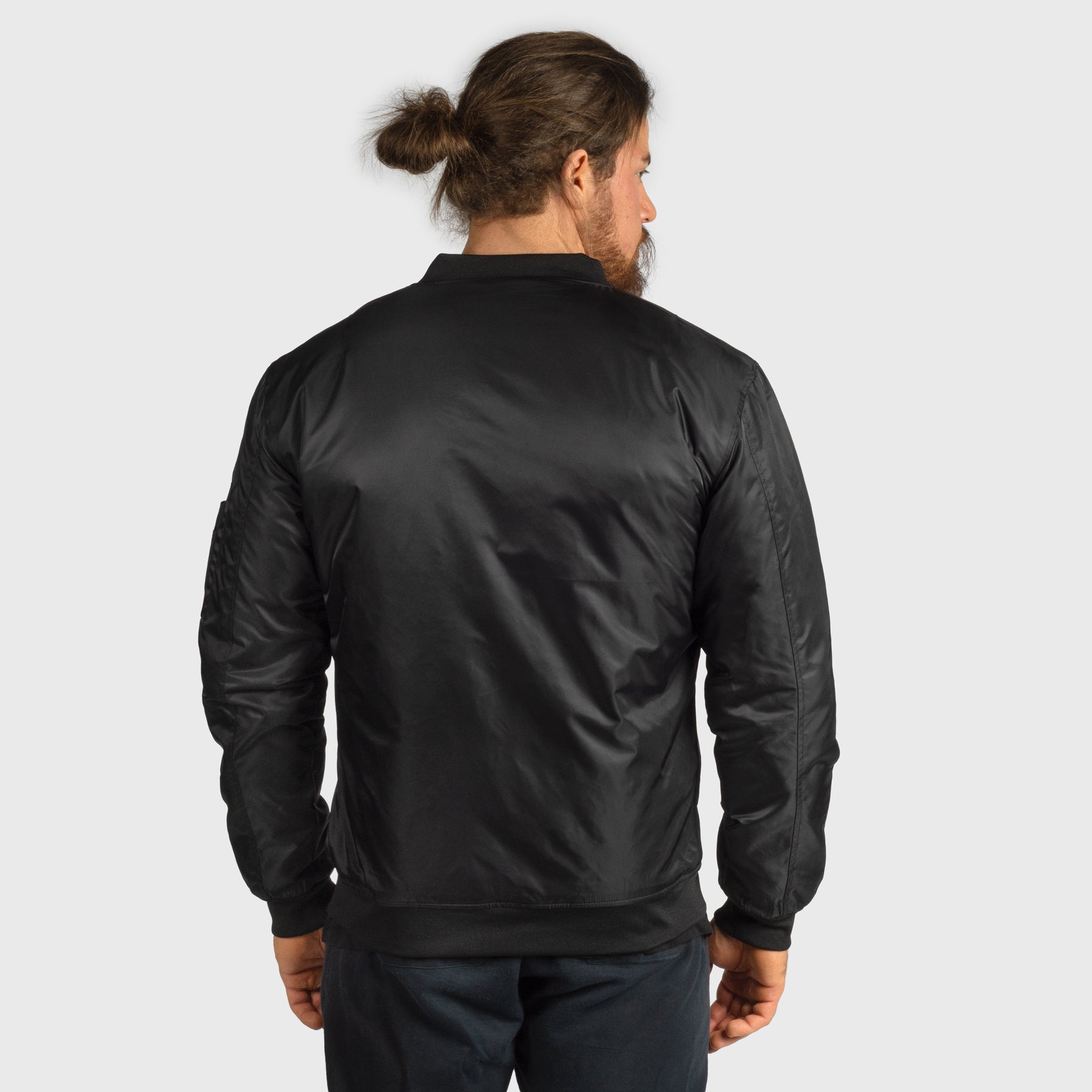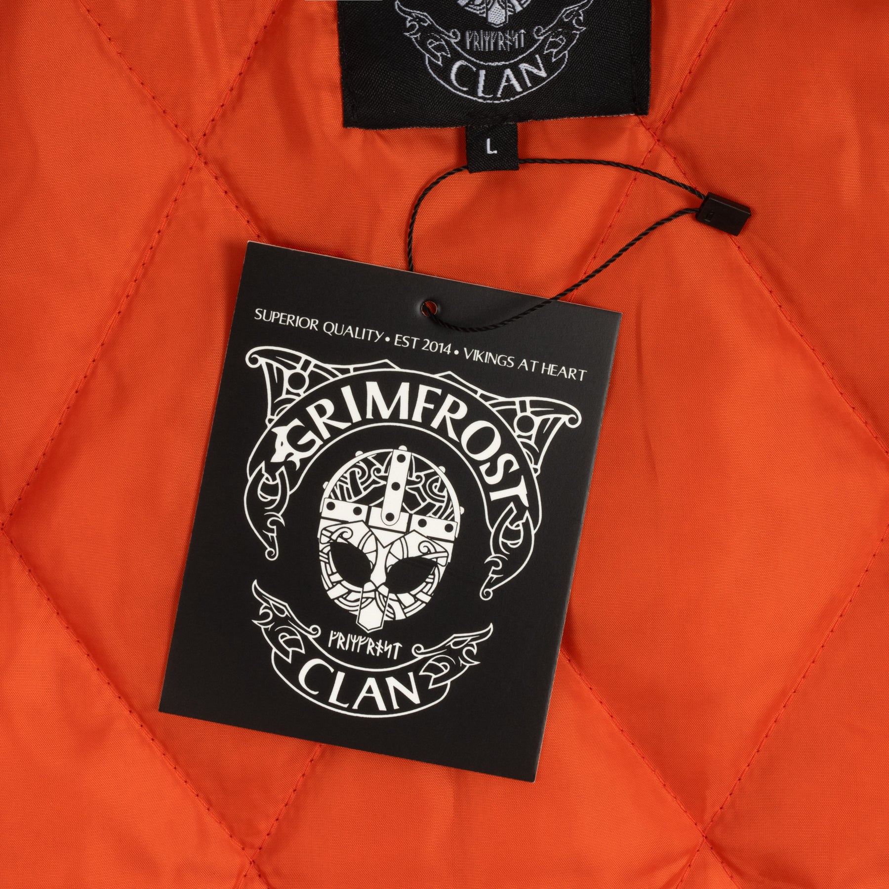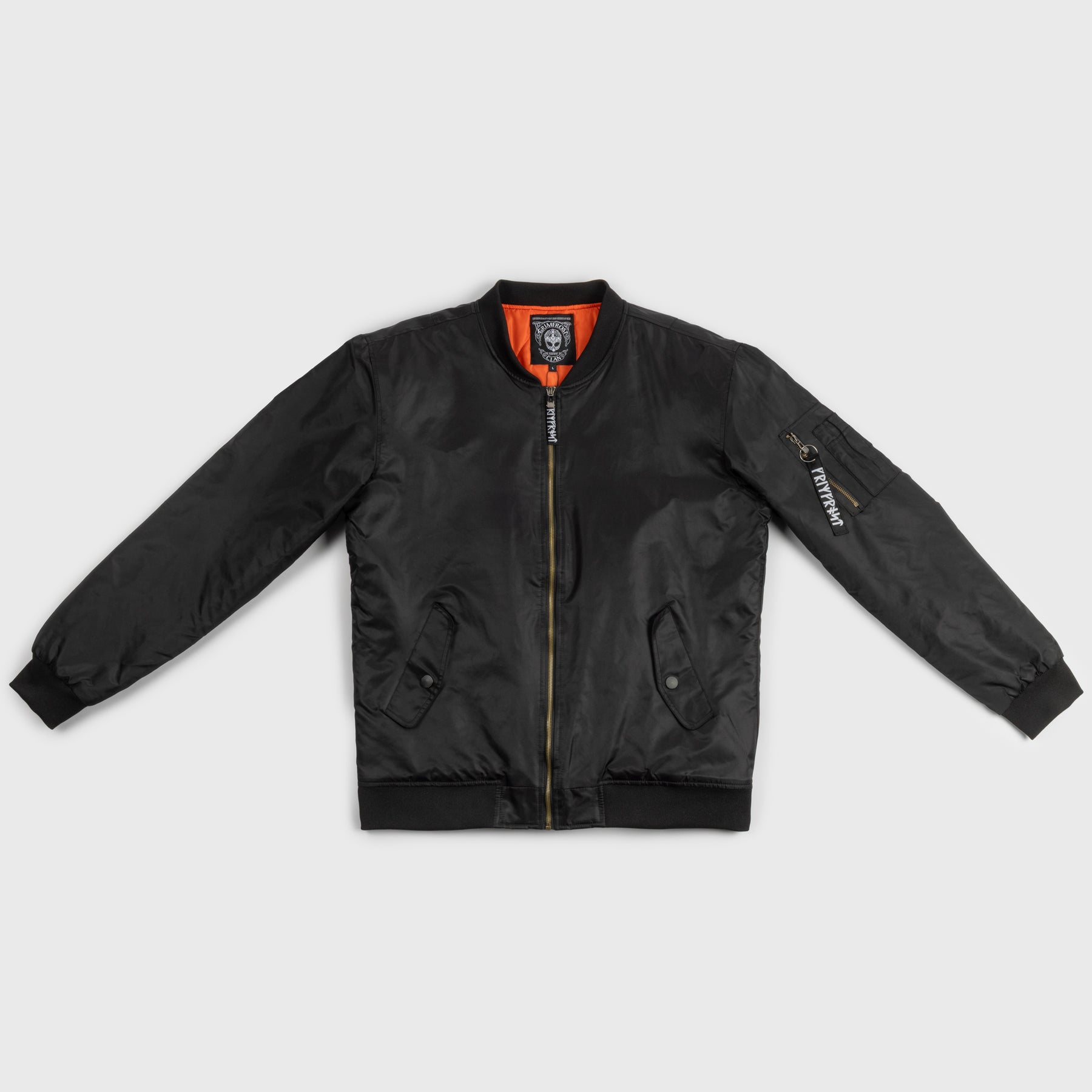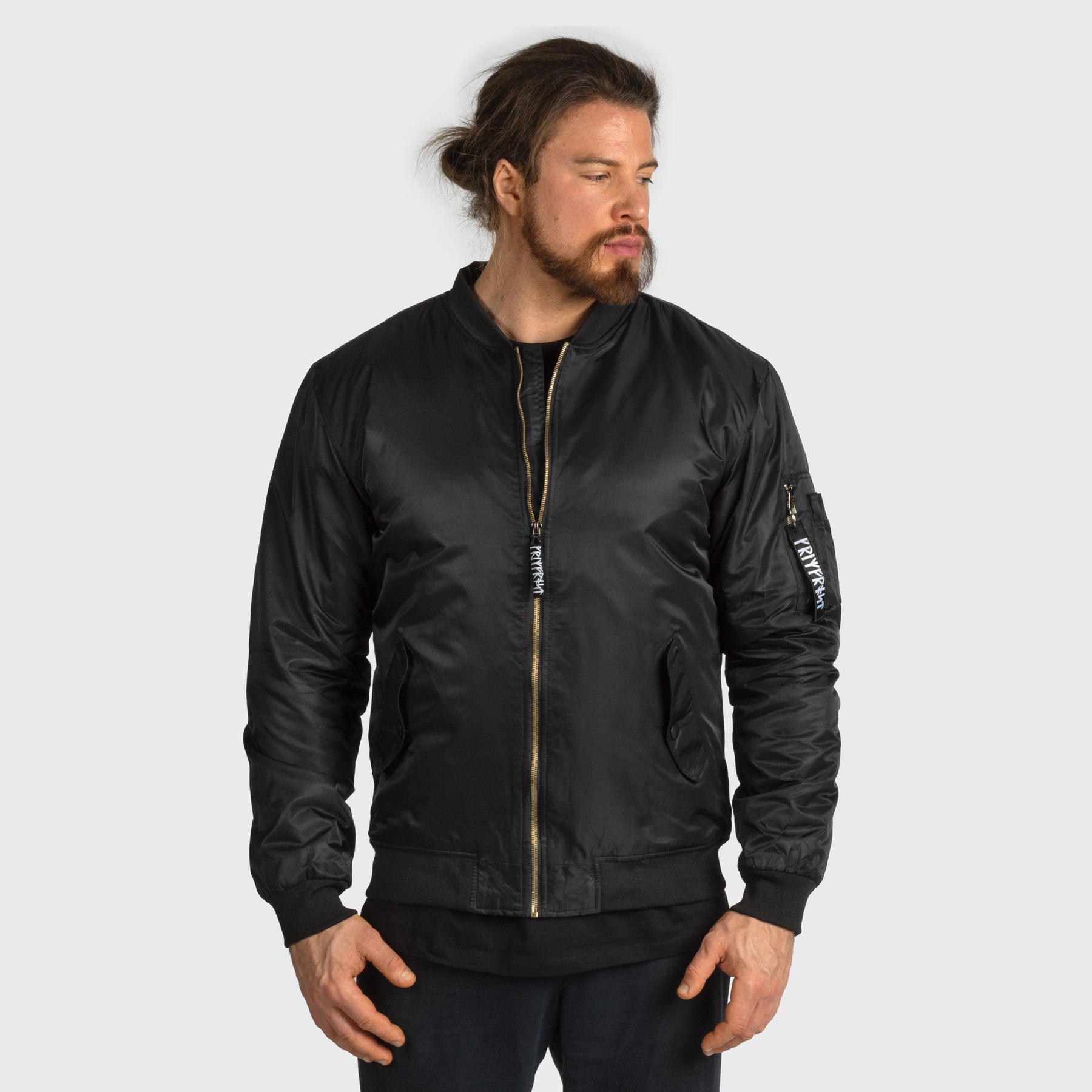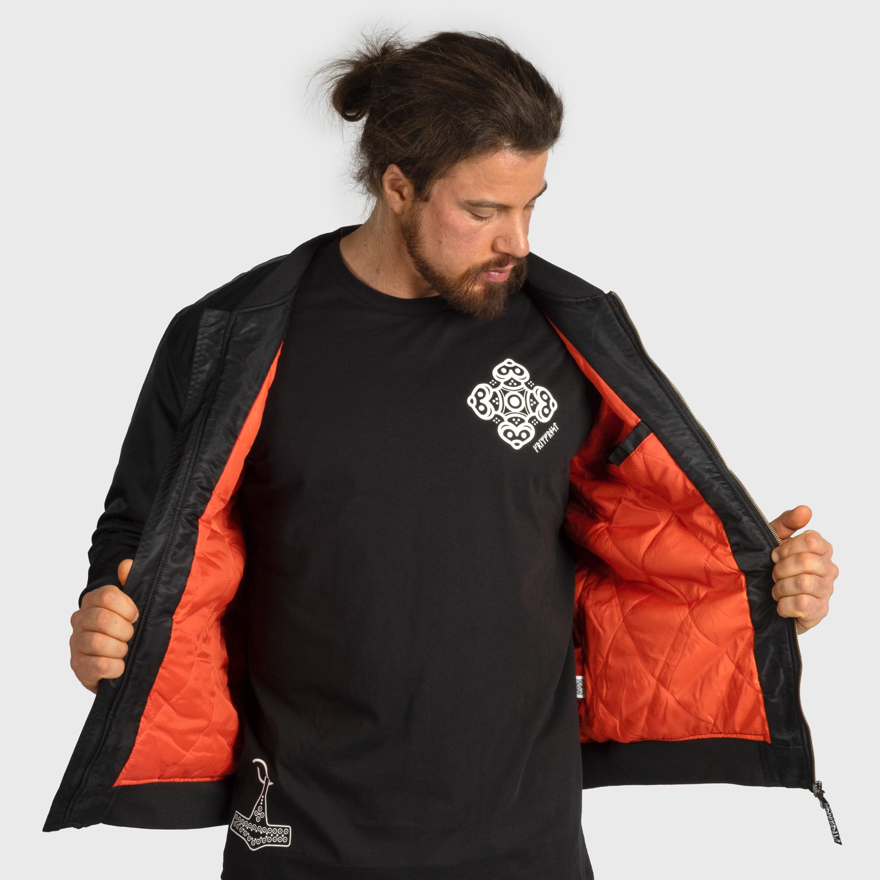 Classic bomber jacket crafted from 100% polyester for durable, all-weather performance. Its timeless silhouette combines urban style with practical functionality, ideal for everyday wear or layering in cooler conditions. Custom made for Grimfrost with runic tags and labels.