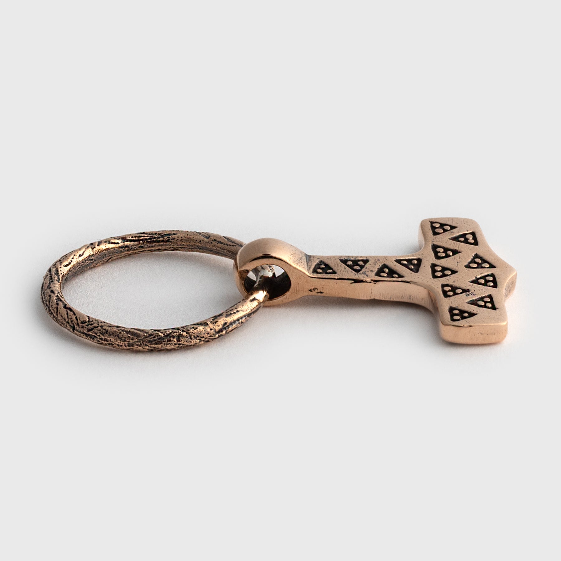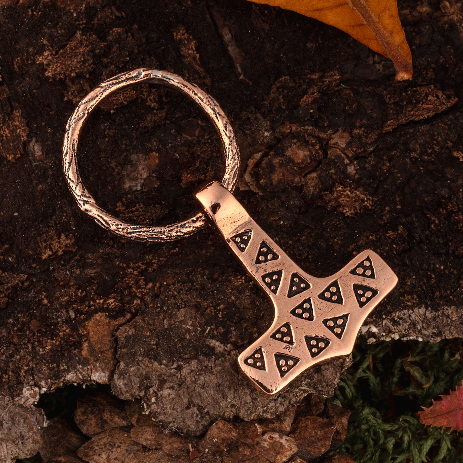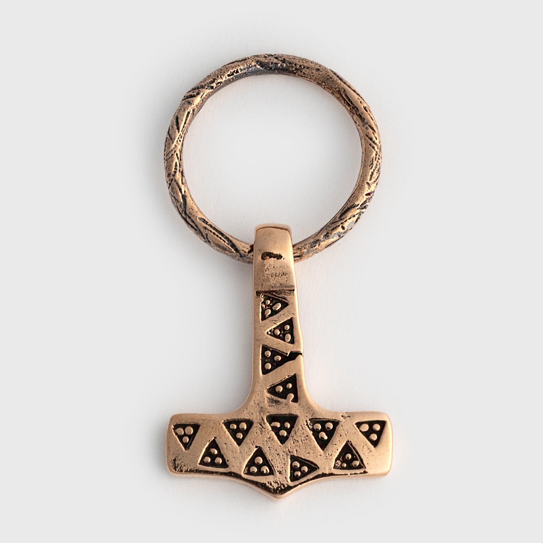 A reproduction of the Thor’s Hammer found in 1828 in the Moheda parish, in Småland, Sweden. The hammer was part of a larger treasure that was placed in a clay urn and buried. The original find is today located at the Småland County Museum in Växjö, Sweden. Just as the original find, this one comes with a ring. Stamping triangles was a common way of decorating jewelry during the Viking Age.