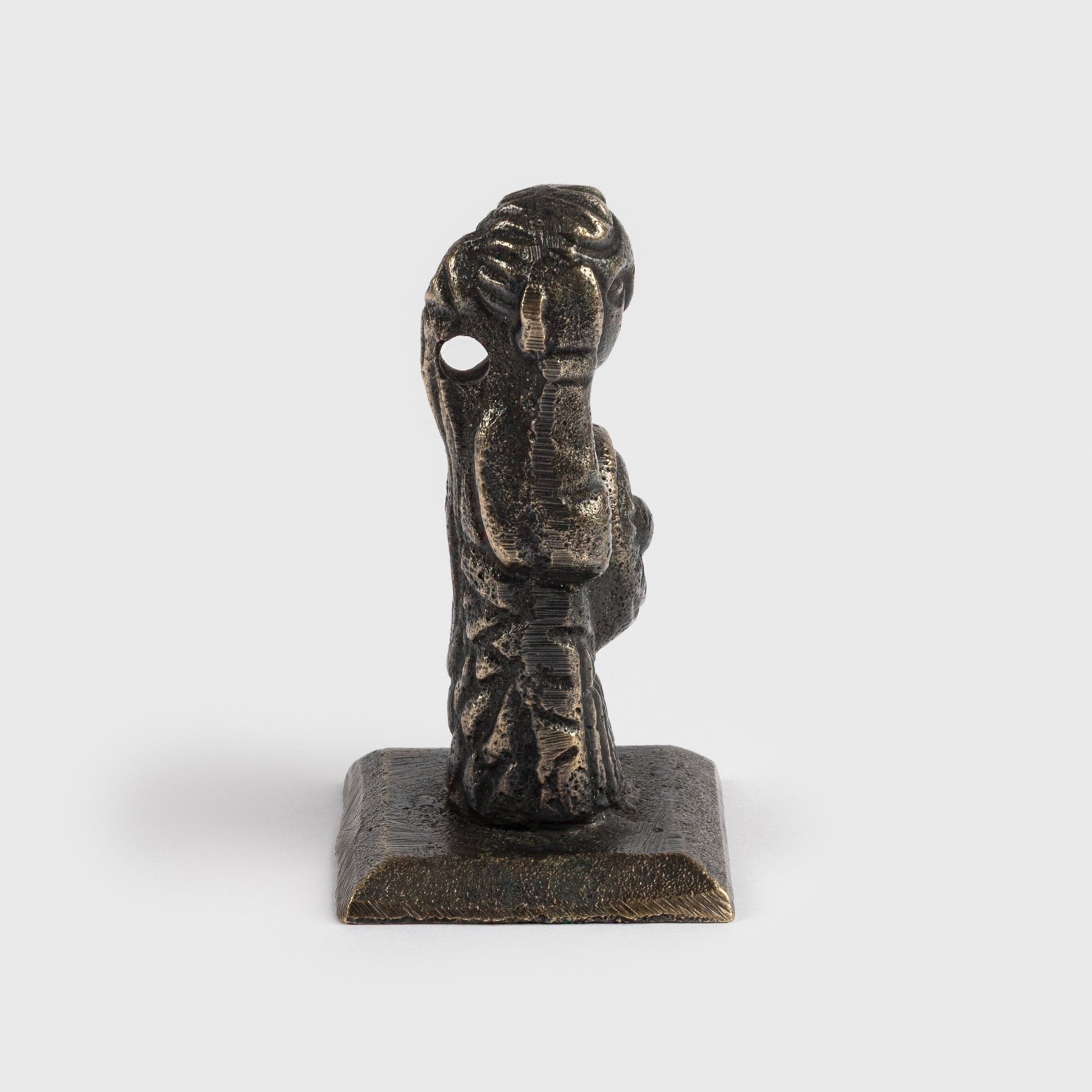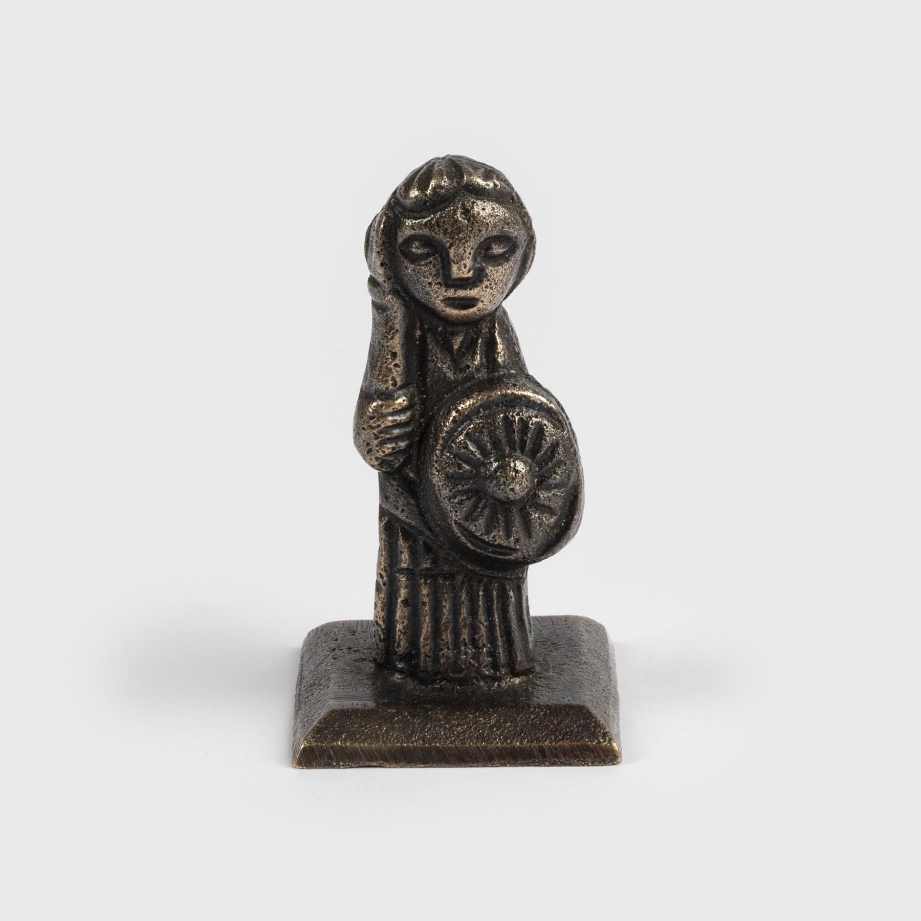 This 7 cm (2.7 inches) tall bronze figurine depicts a Valkyrie. It is based on the original figurine that was found in 2012 on the Danish Island of Funen. The original figurine is dated to c. 800 AD and can be found in the National Museum of Denmark. The figurine is believed to be a Valkyrie. A Valkyrie ("chooser of the slain") is one of a host of female figures sent by Odin to choose who among the killed in a battle may live their afterlife in Valhalla. The figurine wears her hair in a knotted pony-tail and has the long garment seen on many other female representations in Viking art. She carries an upright sword in her right hand and a shield in her left.