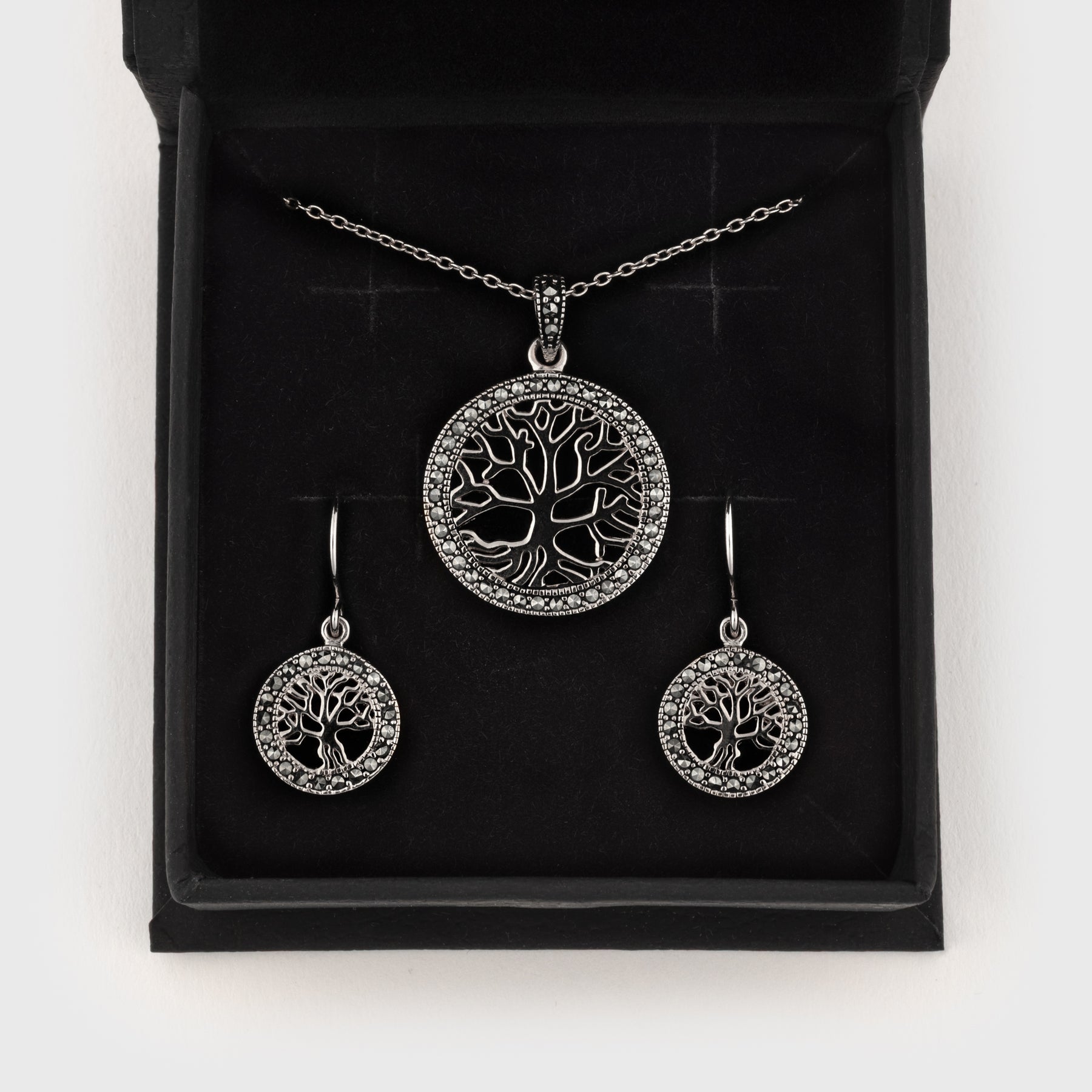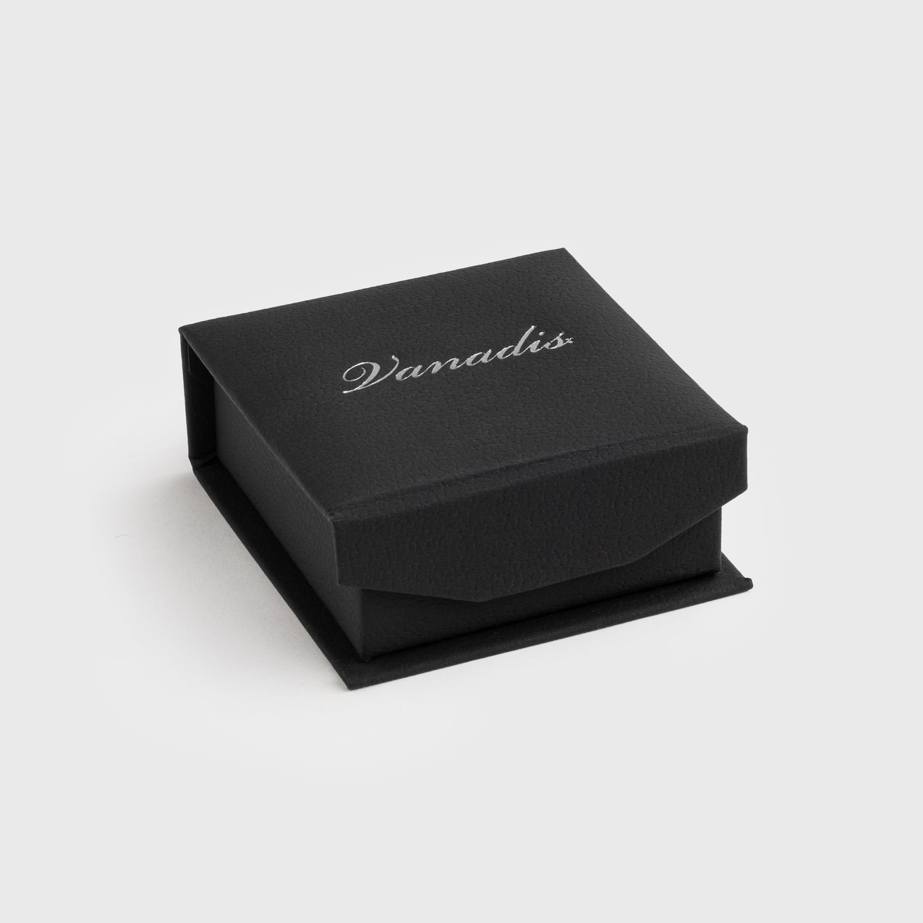 The jewelry box is crafted with a matte black faux leather exterior that gives a refined and elegant appearance. It features a discreet magnetic closure, keeping the lid securely in place while maintaining a smooth design. The interior is lined with soft black foam that both protects and enhances the presentation of your jewelry, making it ideal for all Vanadis pendants and earrings.