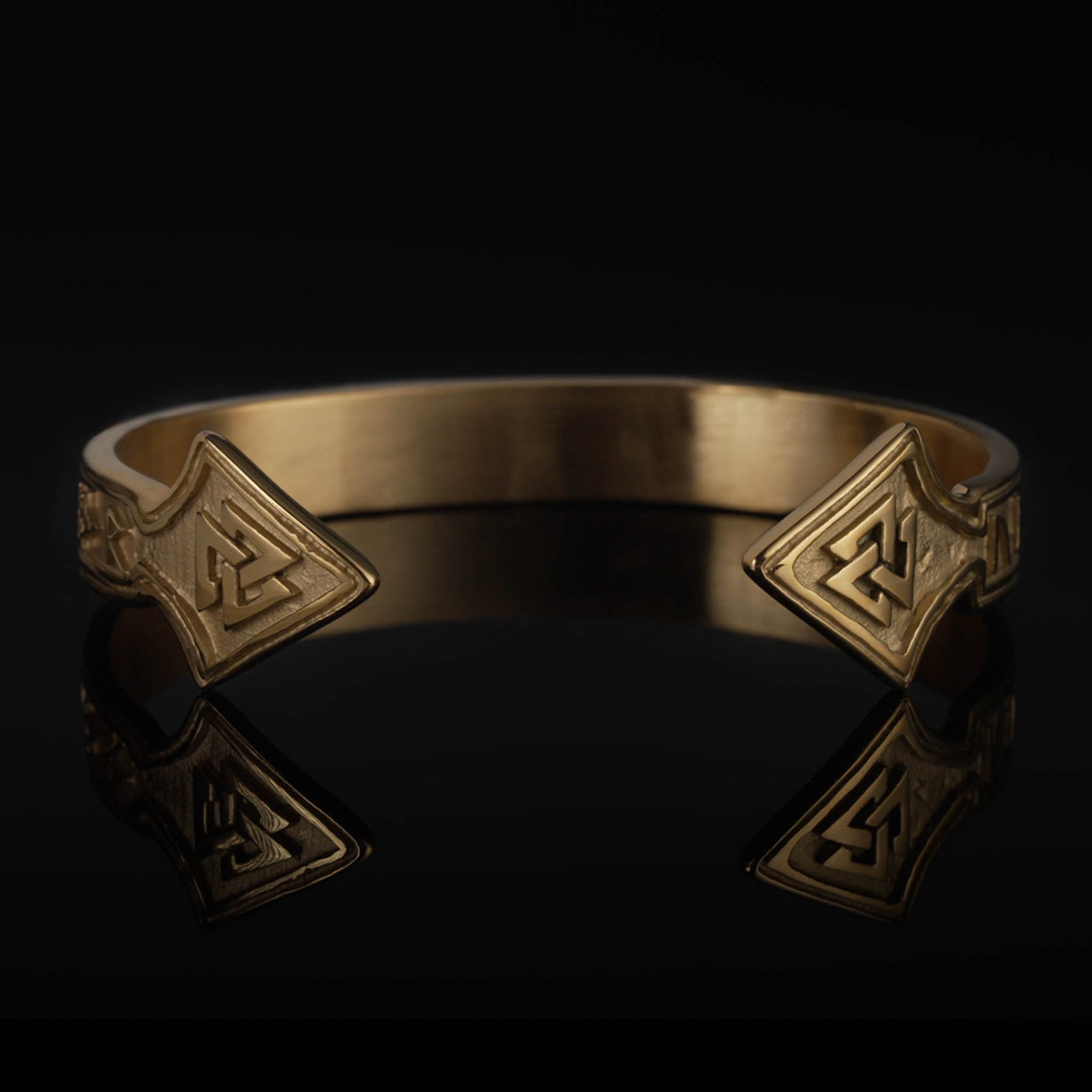 Cuff ending in the shapes of Gungnir, the spear of Odin, with Valknut symbols in the spear head. Written on it with the Younger Futhark is: "Oðin atriði sviðurr alföðr", which translates to: "Odin the Attacking rider, Wise One and Father of all". They are all different names used for Odin.
