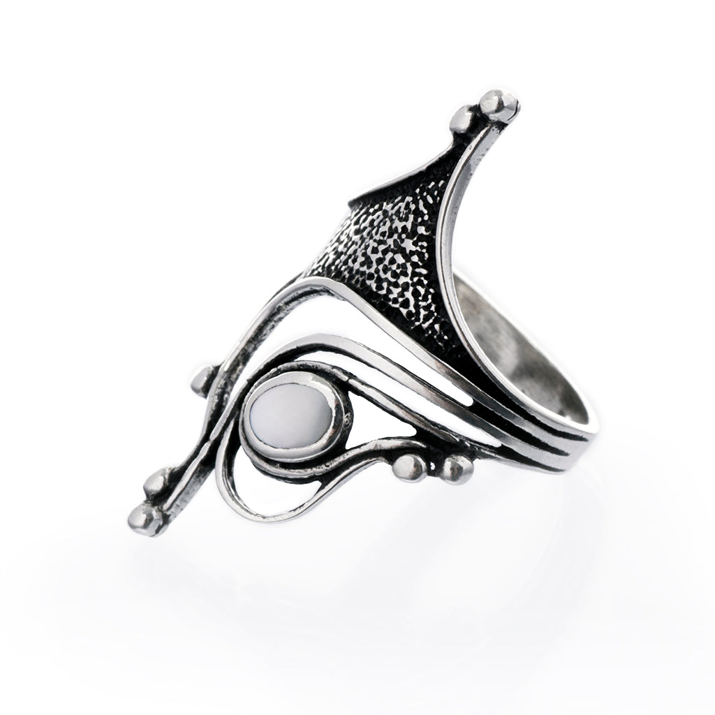 A large ring in solid Sterling Silver with flowing shapes that covers the lower part of the finger nicely.