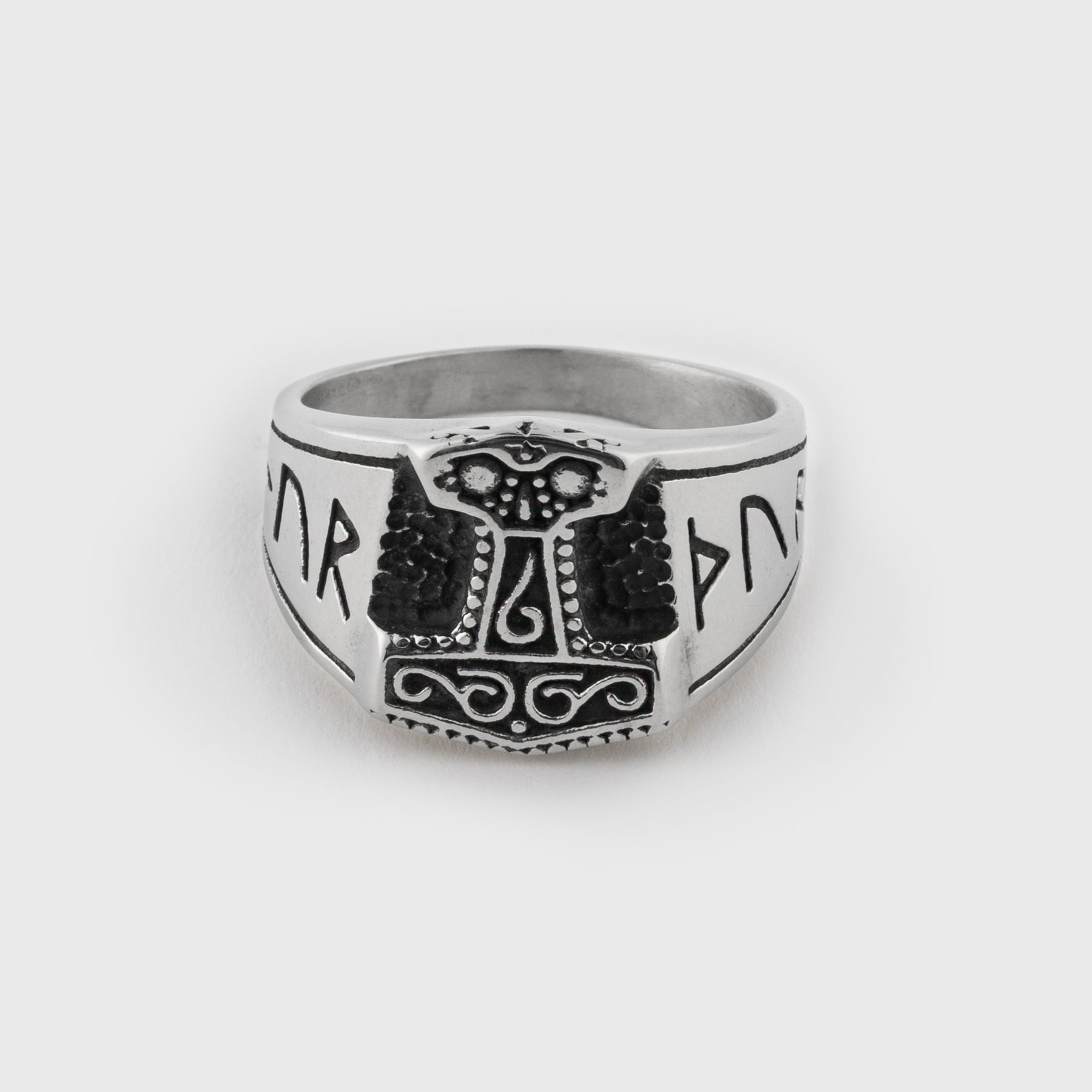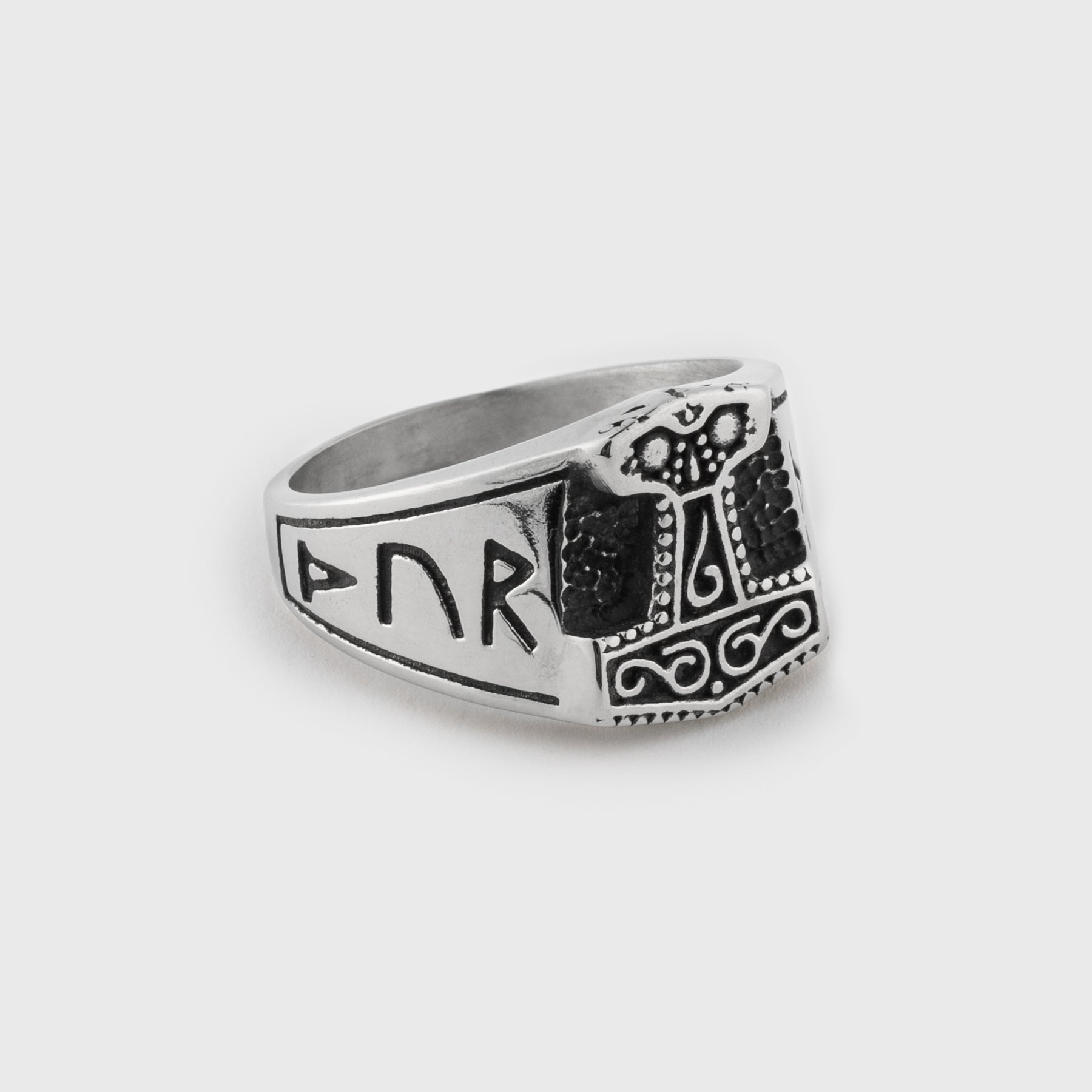 A contemporary design inspired by authentic Viking artifacts. Made out of Stainless Steel, it depicts Mjölnir, the hammer of the Thor and comes in sizes #8 to #15. The sides feature "THOR" written with the Younger Futhark runes.
