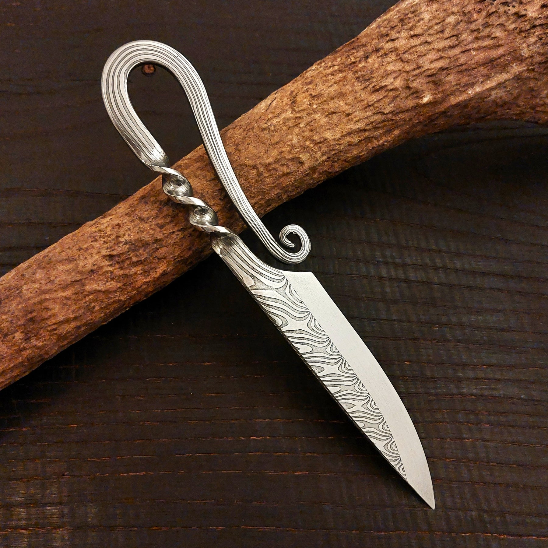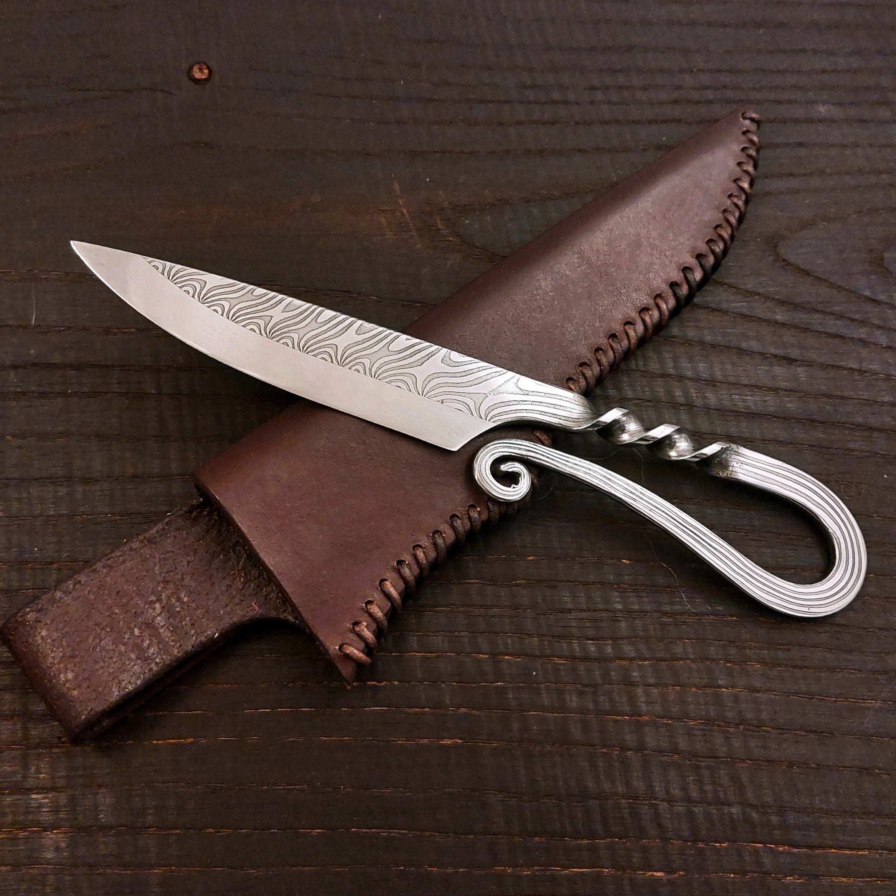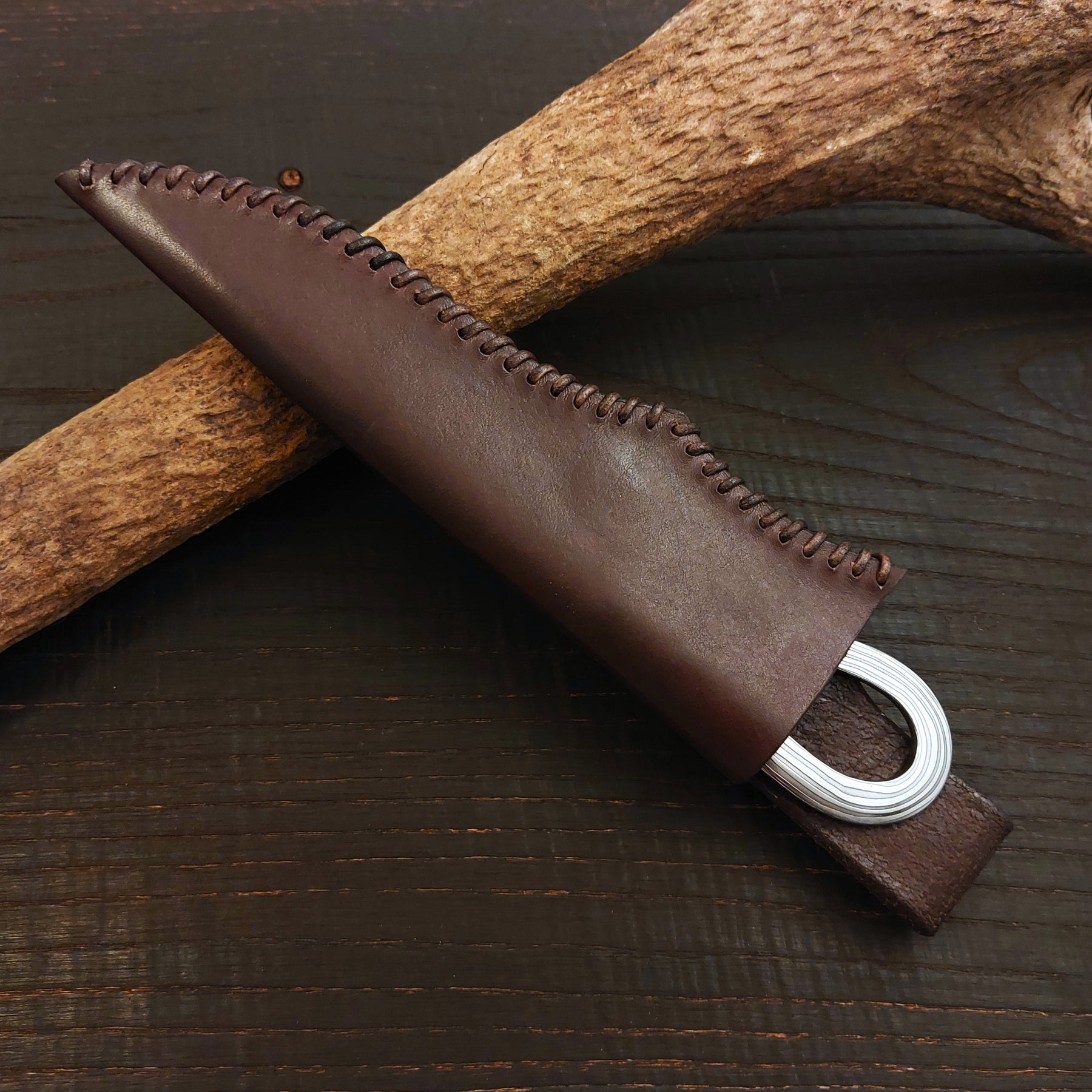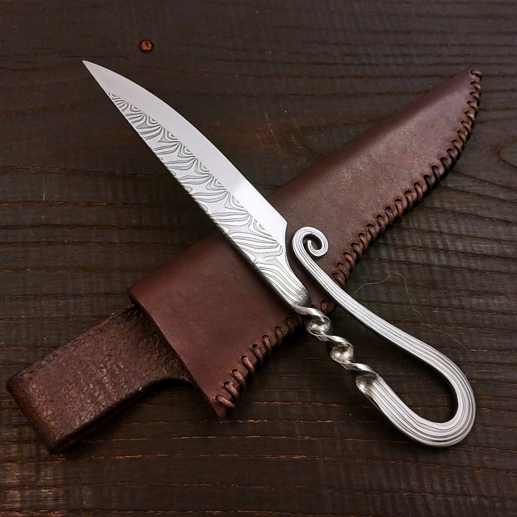 Premium Krumkniv (bent knife) with a pattern-welded blade. It comes with a hand-stitched leather sheath in cognac brown. This piece is individually handcrafted with meticulous attention to historical detail and traditional forging techniques, giving it a character that feels truly alive.