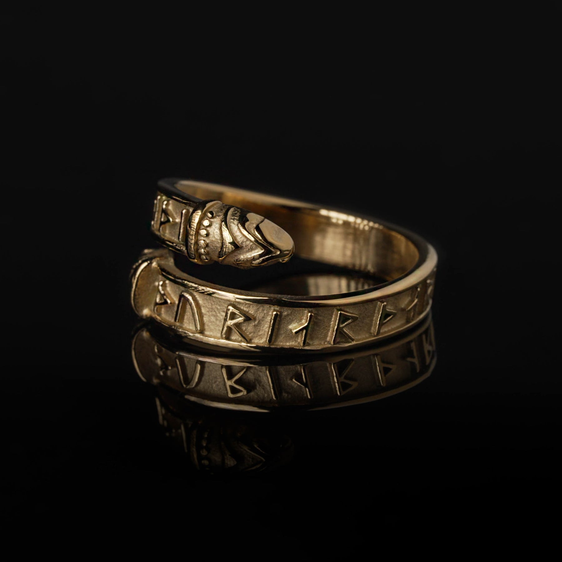 Ring crafted in the shape of a lindworm. Written on it with the Younger Futhark is: "Þorr jarðar burr hlórriði einriði", which translates to: "Thor, Earth's son, the Thundering Storm, He who travels alone." They are all different names, kennings, used for Thor. The ring can be adjusted slightly in size.